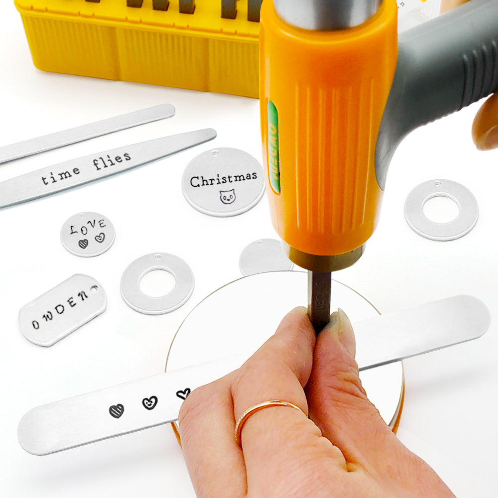 2. Then customize your hand-stamped bracelets with names, dates, patterns, textures, and other special messages.