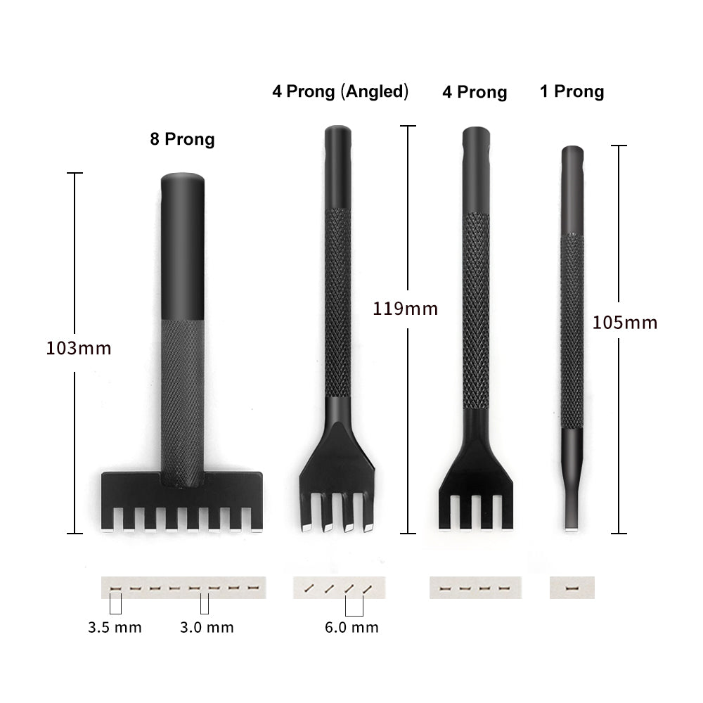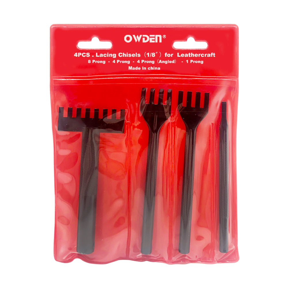 OWDEN 4Pcs leather lacing stitching chisel kit, Including 1Prong, 4Prong, 4Prong (Angled) and 8Prong with a red PVC bag. For 1/8" wide lace. Made from the best alloy steel, these chisels are incredibly strong and tough due to the case hardening process after the chisel is formed. Exquisite black electrophoretic coating to prevent surface corrosion and provide abrasion resistance. Non-slip handle for easy use and is very popular for leathercraft.