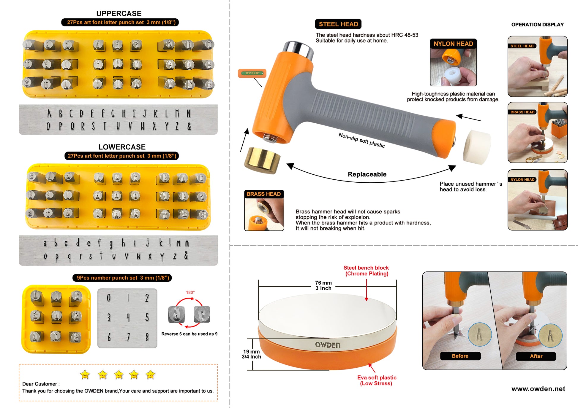 This 65pcs metal stamps kit includes all of OWDEN's essential tools for hand-stamping metal jewelry and keepsakes. The metal stamp, hammer and bench block have all been specifically selected to ensure an easy and successful user experience. These metal stamps are made of CR-V steel to withstand stamping on soft and hard metals (up to stainless steel). They're labeled for easy identification and location and come in a storage box with label slots to keep them organized and within easy reach. The kit also includes a convenient storage box to store all your hand-stamping tools and supplies.