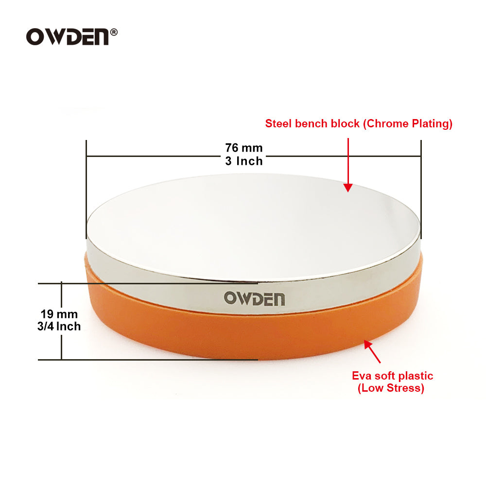 - OWDEN round steel bench block designed for jewelry & stamping work, The steel part is mirror-finished and chrome plated. (No rebound design),The base is made of soft plastic and wraps the bottom of the steel part. The soft bottom helps reduce the rebound force when tapping. It will make the patterns or letters that we work more perfect.